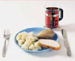 Отварная цветная капуста (150 г) с соевым соусом; картофелина в мундире, кусок хлеба с отрубями, чай с сахарозаменителем.