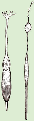 Под влиянием света в палочках и колбочках происходит распад зрительных пигментов (родопсина и йодопсина). Палочки функционируют при свете слабой интенсивности, в сумерках; зрительные ощущения, полученные при этом, бесцветны. Колбочки функционируют днем и при япком освещении: их функция определяет ощущение цветности. При переходе от дневного освещения к сумеречному происходит перемещение максимума световой чувствительности в спектре по направлению к его коротковолновой части и предметы красного цвета (мак) кажутся черными, синего (василек) - очень светлыми (феномен Пуркинье).