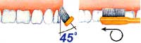 ![]() к зубам под углом в 45 градусов. Справа: чистить небольшими круговыми движениями перемещаясь в сторону коренных зубов. |