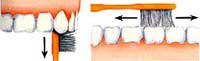 ![]() Слева: особенно основательно чистите внутренюю поверхность зубов. Справа: установить щетку на жевательную поверхность. Чистить с лёгким нажимом |