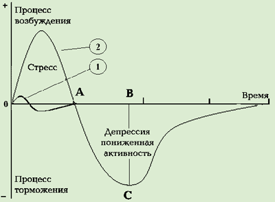 На графике приведены процессы (две кривые) возбуждения и торможения организма при разных стрессовых ситуациях. 1-ый график отражает реакцию организма на небольшой (малой амплитуды и продолжительности) стресс, с которым мы встречаемся повседневно. Кривая 2 отражает реакцию организма на сильный стресс. В отрицательной фазе организм наиболее энергетически ослаблен и на этом фоне могут развиваться различные болезни, особенно в периоды затяжной депрессии. По статистике до 70% обращающихся в поликлинику по поводу соматических заболеваний имеют ту или иную форму депрессии.